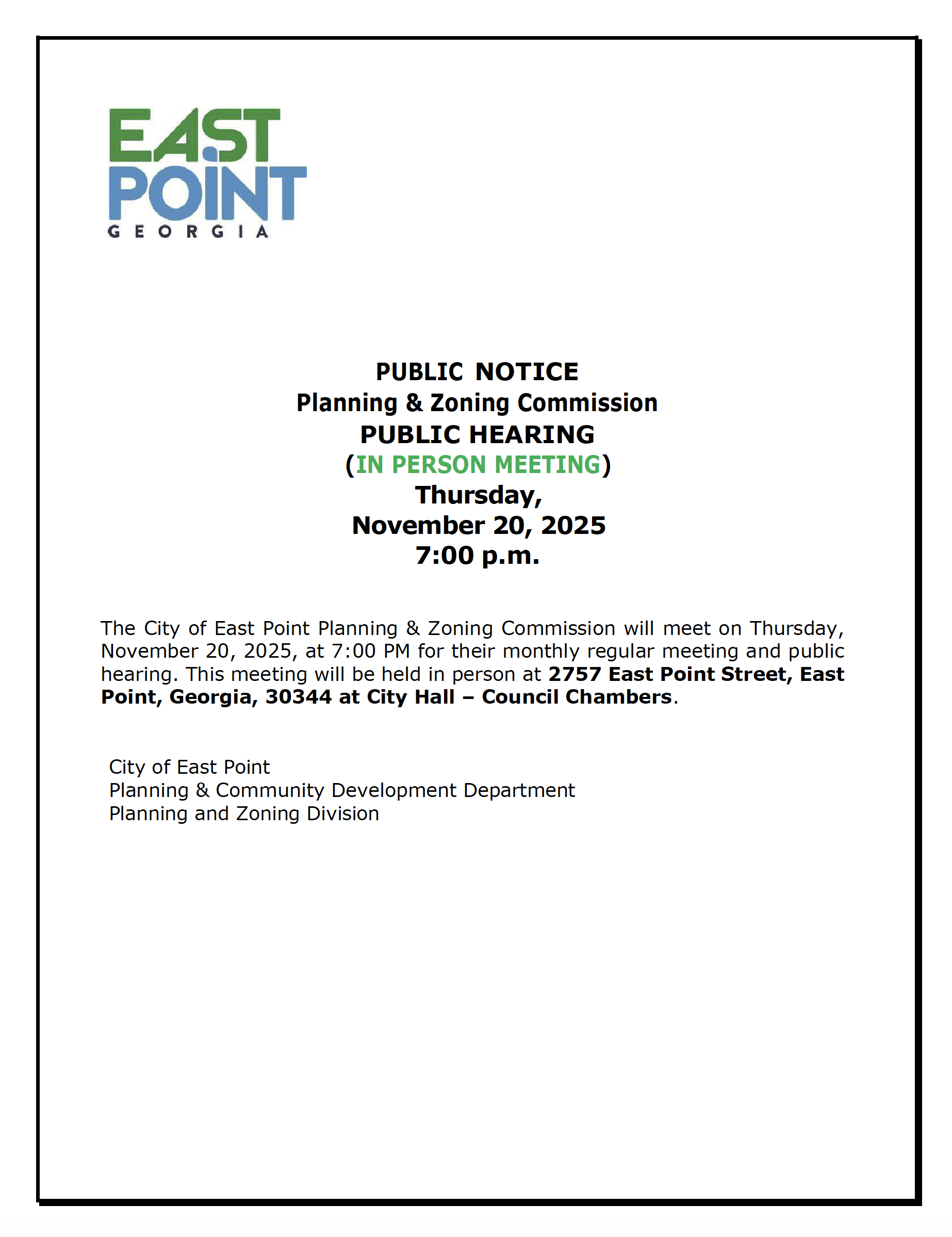 November 20 @ 7:00 PM - 9:00 PM Planning & Zoning Commission Public Hearing City Hall 2757 East Point Street, East Point, GA, United States
