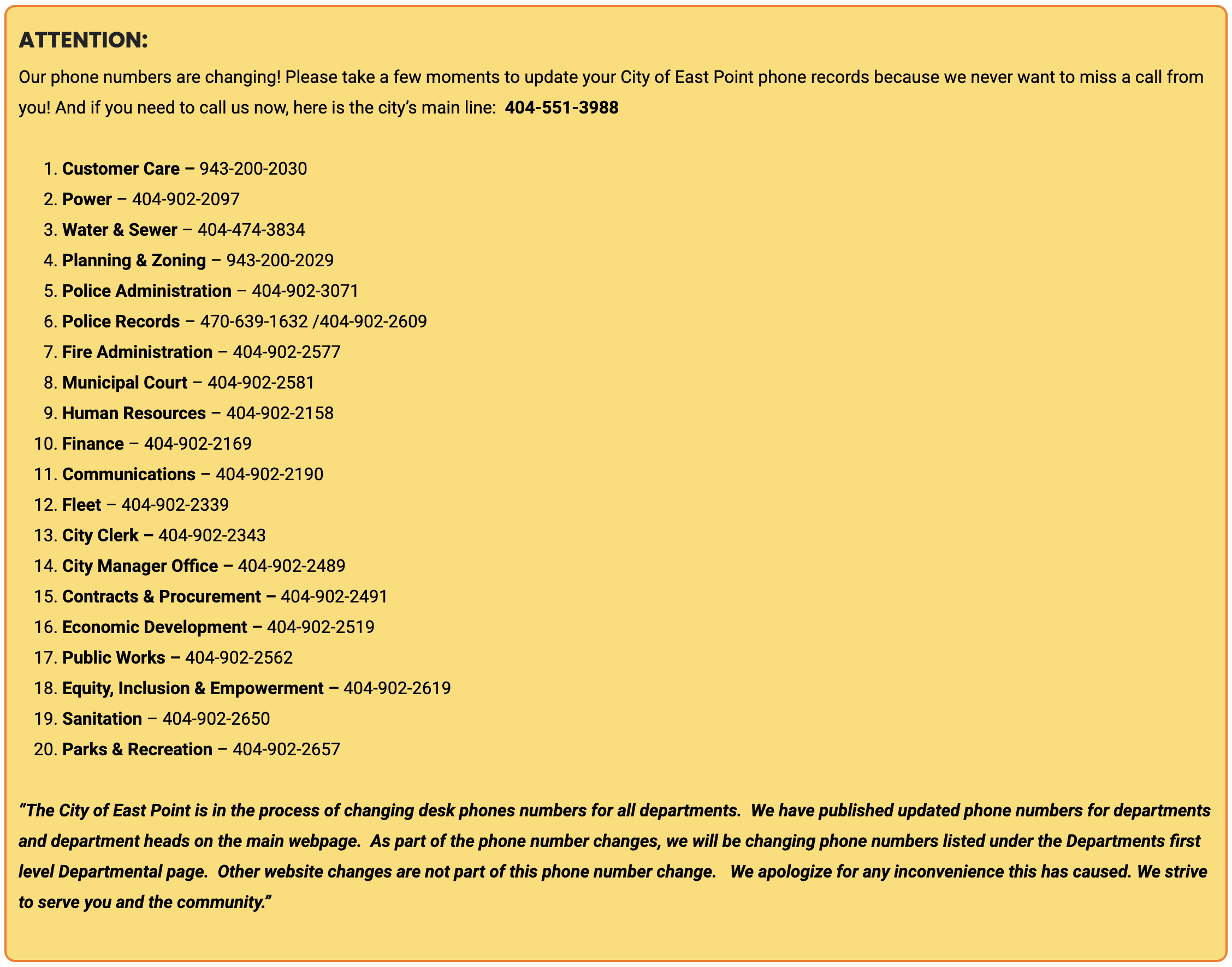 “The City of East Point is in the process of changing desk phones numbers for all departments.  We have published updated phone numbers for departments and department heads on the main webpage.  As part of the phone number changes, we will be changing phone numbers listed under the Departments first level Departmental page.  Other website changes are not part of this phone number change.   We apologize for any inconvenience this has caused. We strive to serve you and the community.”