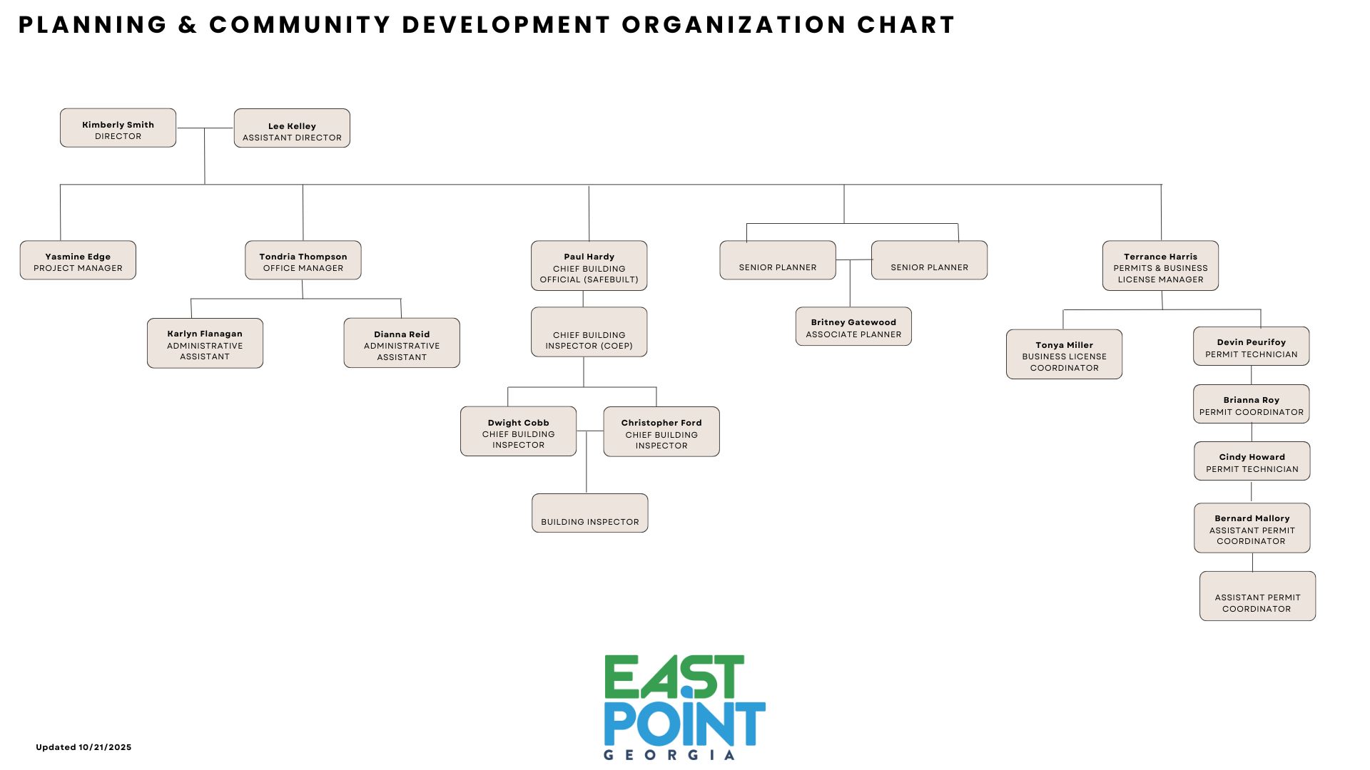 The Department of Planning & Community Developments’ purpose is to serve the public in the development, maintenance and redevelopment of properties located in the municipal limits of the City of East Point, Georgia. Our department guides the city of East Points’ growth and development through enforcing building codes and ordinances to protect the life, safety and welfare of East Point’s citizens and patrons. We accomplish this through our four distinct, yet interrelated divisions: Permits, Building Inspections, Planning and Business License.