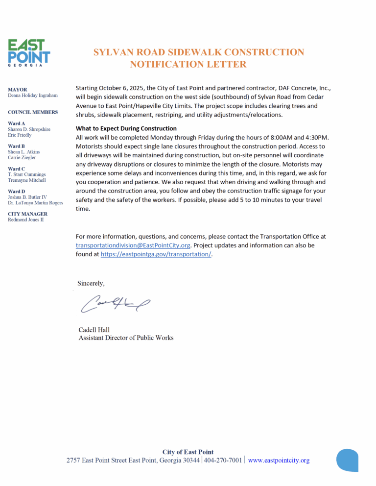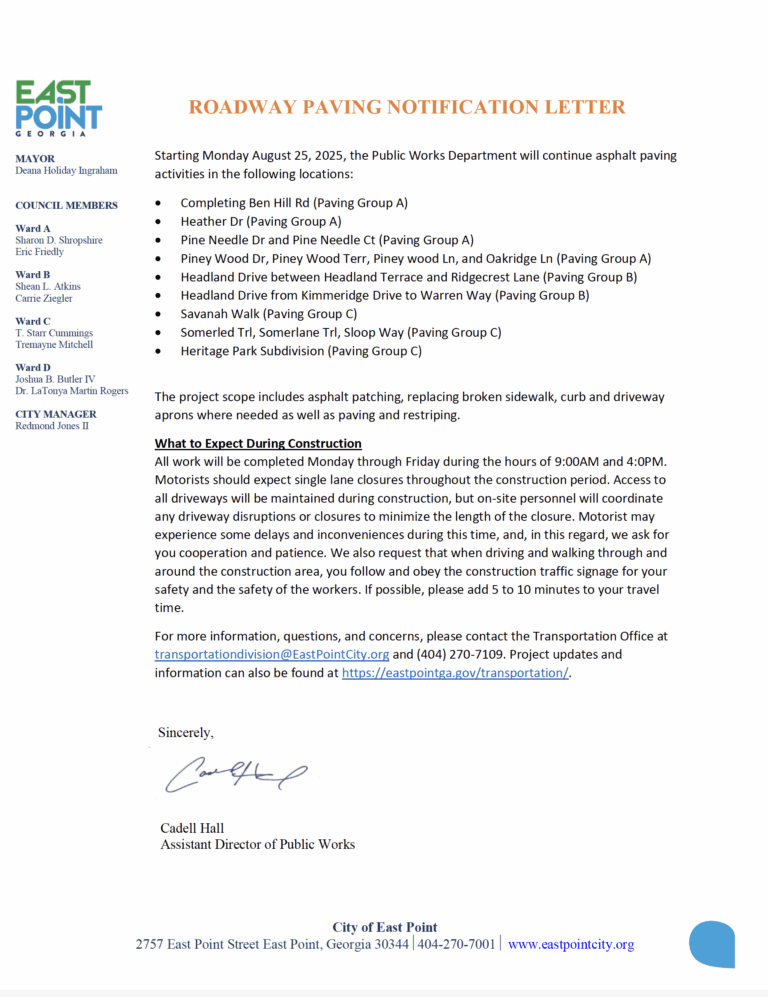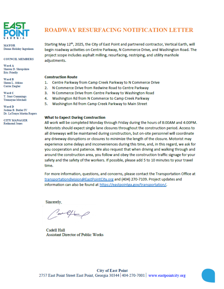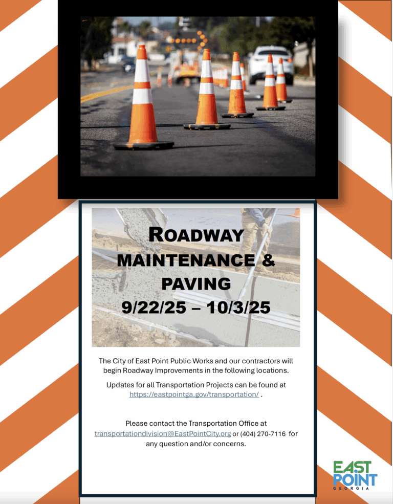 The Transportation Division of Public works is responsible for designing, planning and maintaining the transportation system within the City of East Point, which has over 165 miles of paved streets, and several miles of sidewalks. This Division also provides a variety of services related to work within the city’s right of ways including plan reviews for new project developments and administers all ROW permits for work within the city’s right of ways. In addition, the Transportation Division also provides engineering services and technical assistance for all divisions in Public Works and other city departments including Police, Fire and Parks & Recreation.