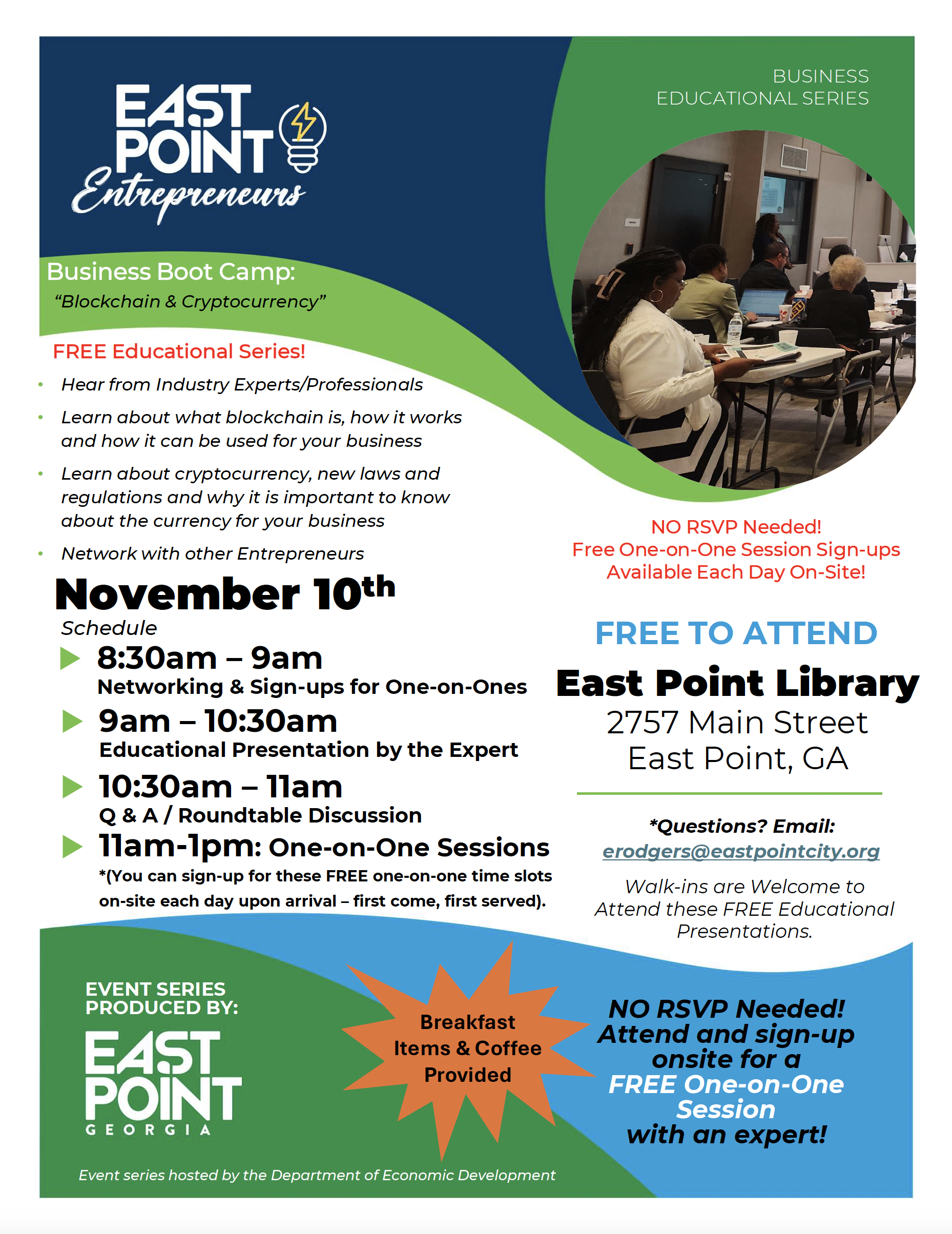 November 10 @ 8:30 AM - 1:00 PM East Point Entrepreneurs: Business Bootcamp Series East Point Library 2757 Main Street, East Point, GA, United States